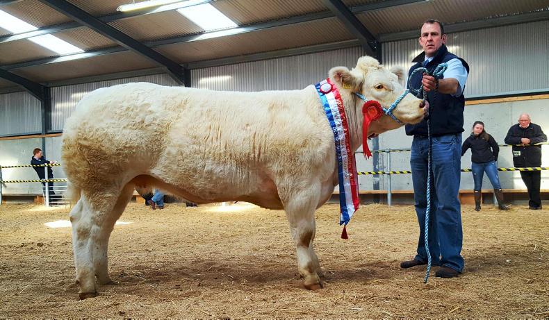 Only four of the 12 heifers presented for sale sold, to an average of €2,100, and this followed a similar trend to the bulls, with averages back by €700 (€2,824 in 2015). Picking up the top spot in the pre-sale show in the female ring was David Pearson, Ballacolla, Co Laois, with Villablues Idyllic (photo below).