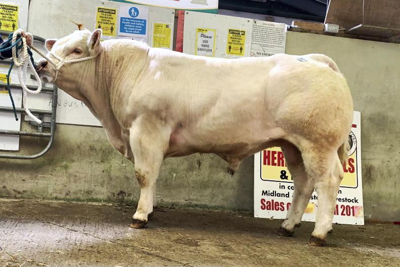 Lydon McHugh’s bull Oakhill Paulo sold for €3,000. This October 2019-born Charolais bull was sired by Whitecliffe James, with Doonally New also in the back breeding.