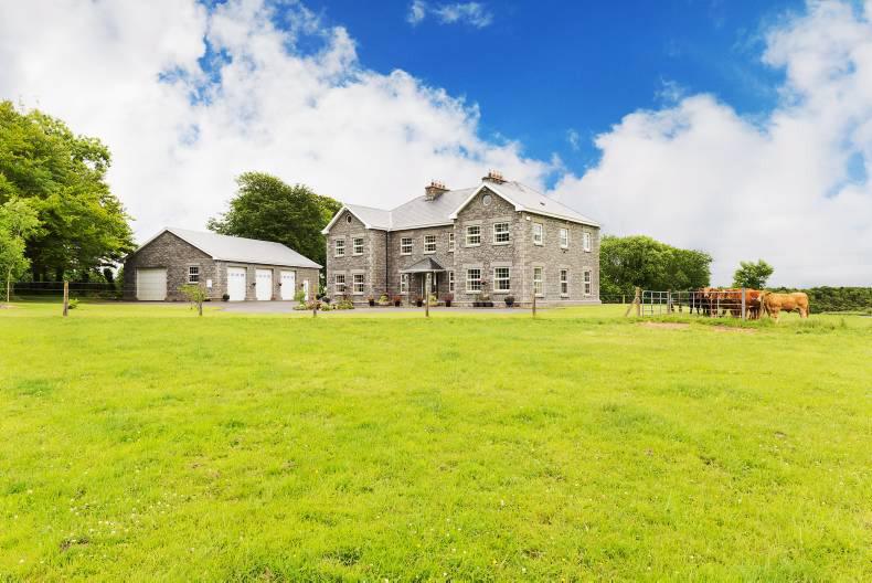 Standing on circa 40 acres, the property comes to the market with a fabulous stone-faced two-storey residence, a large triple garage, a farmyard, five acres of lake and circa 29 acres of pasture.