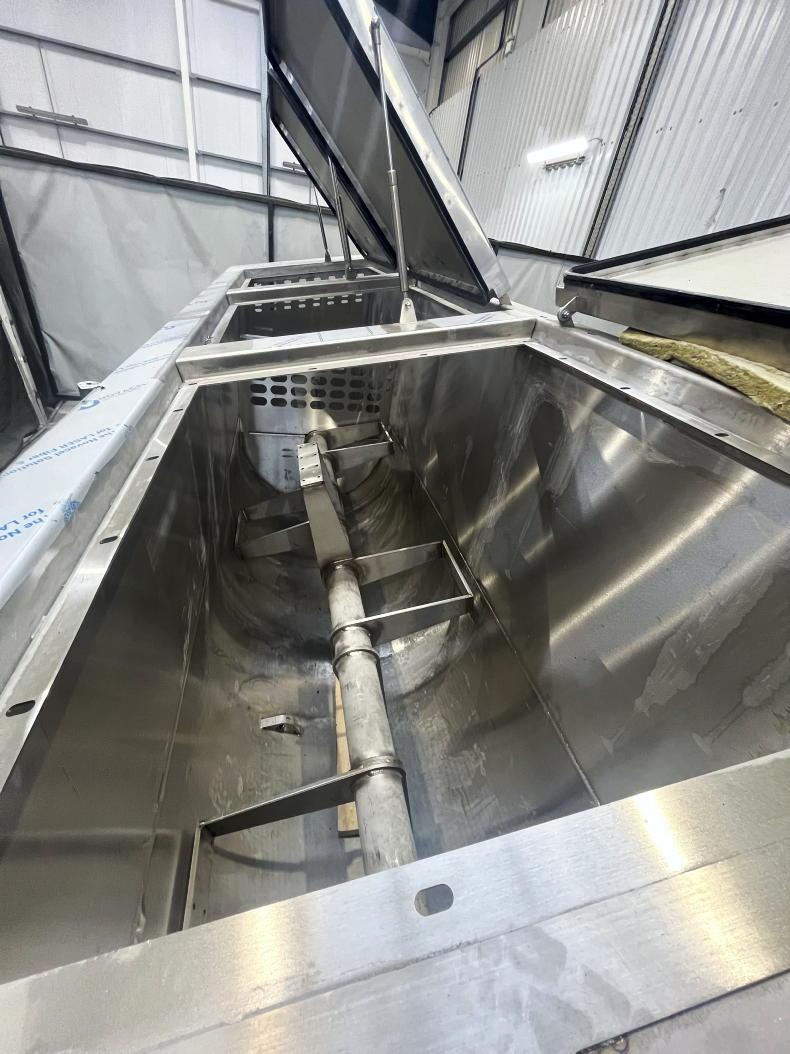 Food waste from kitchens or households is loaded into one side of the machine. It is important that the waste is source-segregated to avoid contamination from plastics or other unwanted materials, Gerry explained. Inside the chamber, the waste is slowly turned while heat pads raise the temperature to 70°C and fans circulate air throughout. Before leaving the chamber, the air passes through a carbon filter to eliminate odours.