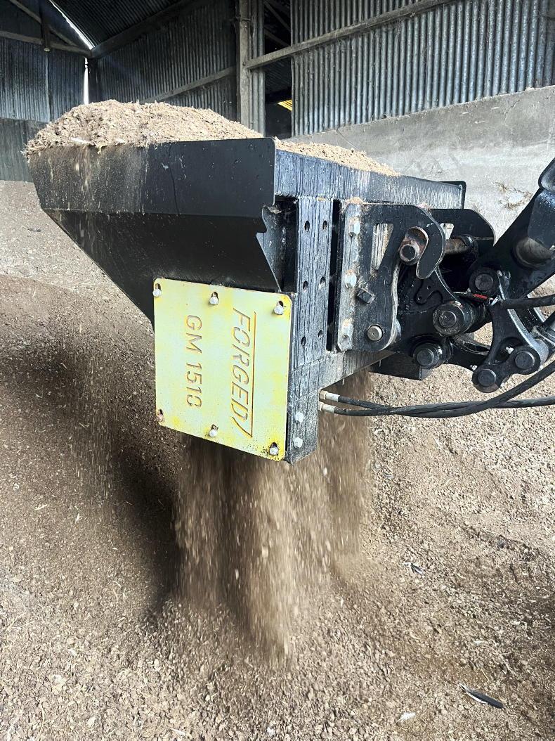 This is a two-stage process. The chicken manure is loaded into a hopper using a specialised bucket which Sean designed specifically for the system, and is then automatically fed into the ZEDE system. In the first stage, the chicken manure is heated and dried, releasing vapour that is rich in ammonia. This vapour is then collected in a storage tank, capturing that ammonia.