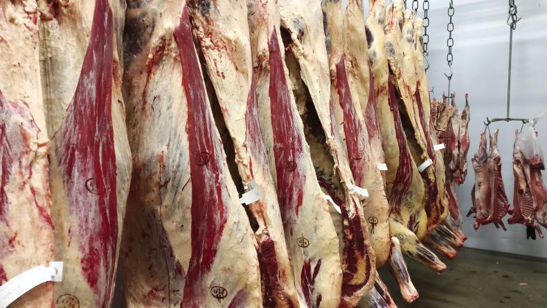Beef carcases hanging in the Shetland Livestock Marketing Group abattoir in Lerwick