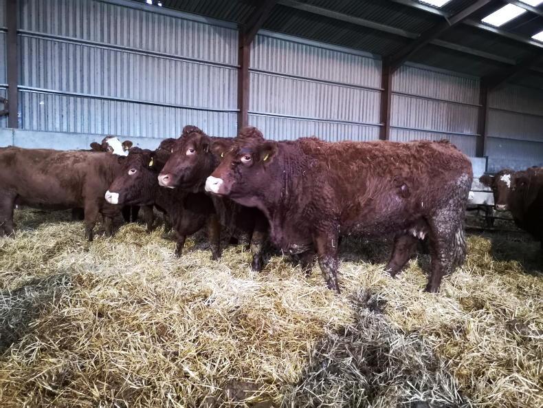 As a runback, the cattle have access to a grass field due for reseeding next spring. Here they are fed silage straw. A 550kg bale of straw is lasting five days and they are getting two bales of silage. This works out to 2kg of straw and 20kg of silage per head per day, or around half of their daily intake.