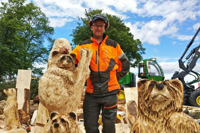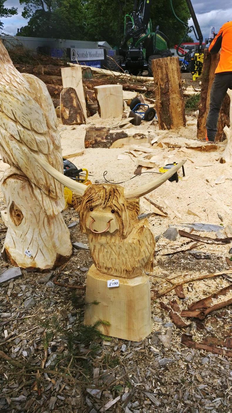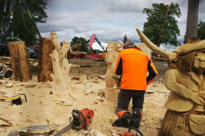The buzzing of chainsaws can be heard long before you ever see the Forestry Arena at the Royal Highland show. Dressed head to toe in bright orange and black safety gear, the carving demonstrators spend their whole day sawing, sanding and burning their timber creations.