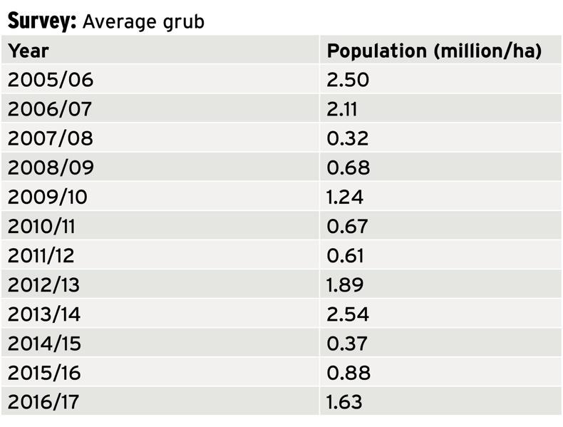 The warning comes from results of the annual grub density survey which has been running since the mid-1970s. Over the last 20 years the numbers of grubs have fluctuated, but overall there is a general growing trend. The latest results have shown that the average density in fields surveyed was 1.6 million grubs per hectare. Milder autumns and winters have been blamed for the grub number rise.