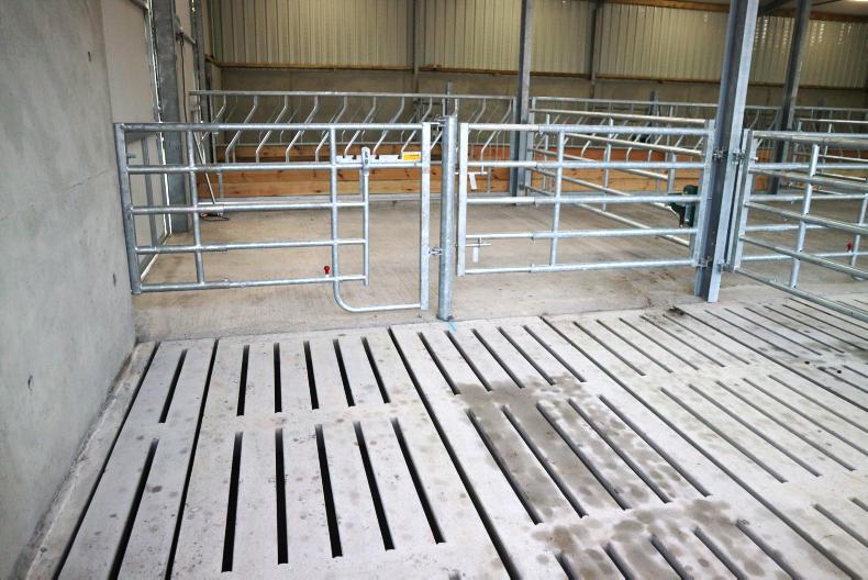 The floor falls towards the slats, where runoff is collected. Teemore Engineering supplied all the penning and the feed barriers and PJ Minogue fitted them. The creep gate can be closed off easily if required. Gary was thinking ahead with the design.