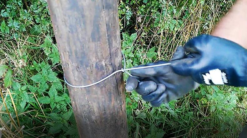 Once all the materials are sourced it is time to lay out the fence. Stephen usually positions the straining posts first. PDM 2.1m long strainer posts were used in this example. The post is about 5in in diameter. When the two straining posts are erected, it is time to erect the fence line. When erecting electric fencing, you must first tie the egg insulator to the straining post. Use a 2.5ft length of high-tensile wire when doing this. Tie this short length of wire near the top of the post. Wrap the wire around itself, all the while creating a special knot so the wire will not slip under pressure. To finish off this knot, twist the wire seven or eight times keeping the twists neat and tight. Excess wire at the end of the twists can be cut off. Next, put on the egg insulator. Tie the wire around the insulator creating a knot at the crossover of the egg so it won’t pull sideways when the wire is being strained later on.