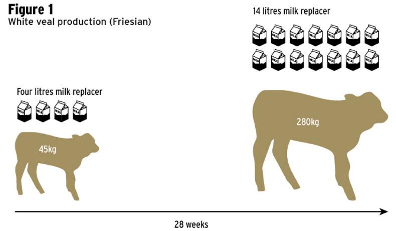 White veal is the meat from an animal slaughtered less than eight months of age at 280kg to 300kg liveweight from a predominantly milk replacer-based diet.
