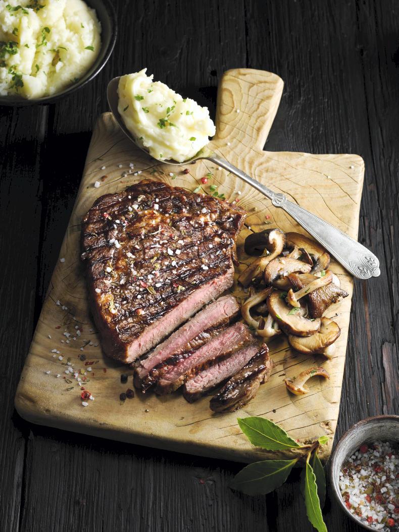 Seared striploin steak with sauce Diane and roast garlic mash