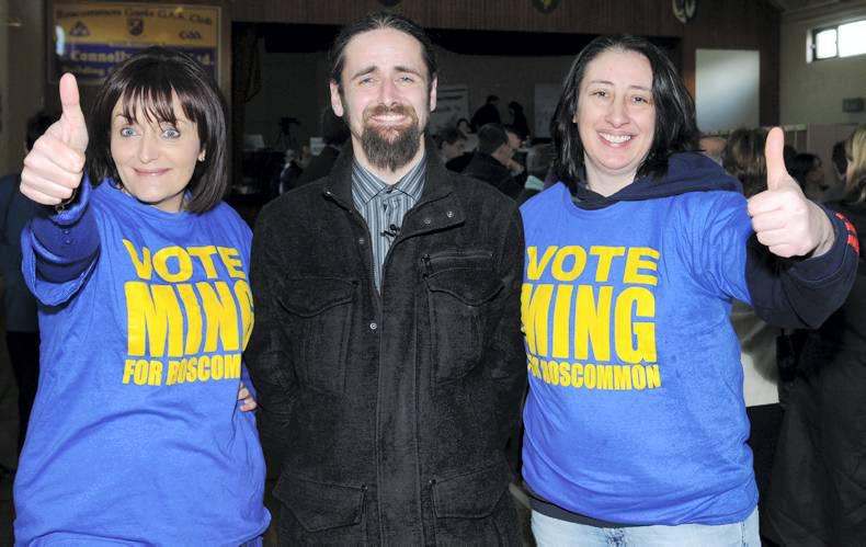 Luke "Ming" Flanagan with supporters Fiona Flanagan and Denise Swannick at the count in the Hyde Centre in Roscommon.
