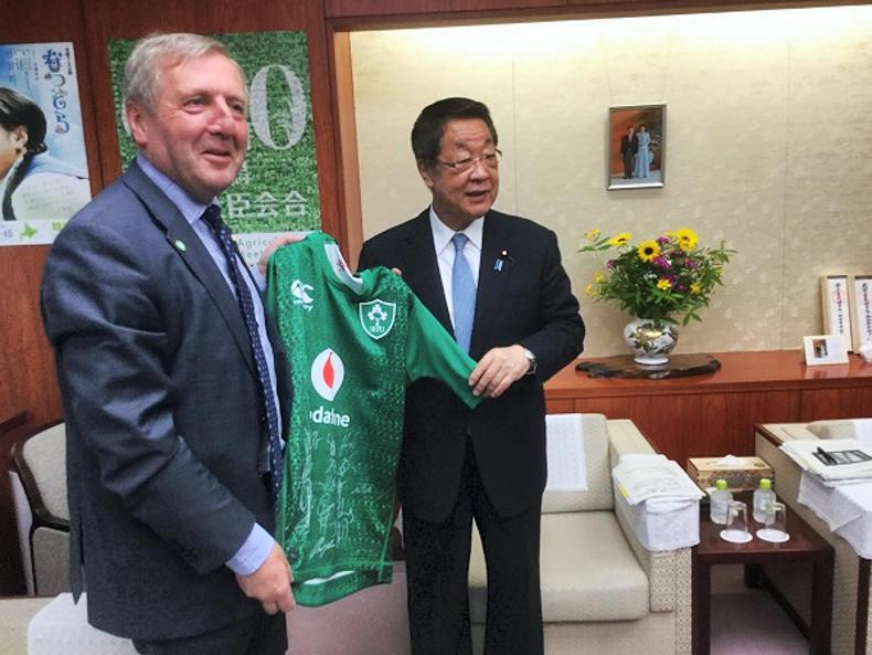 Minister Michael Creed presented his Japanese counterpart Takamori Yoshikawa with an Irish rugby jersey when they signed an agreement on Irish sheepmeat access to Japan.