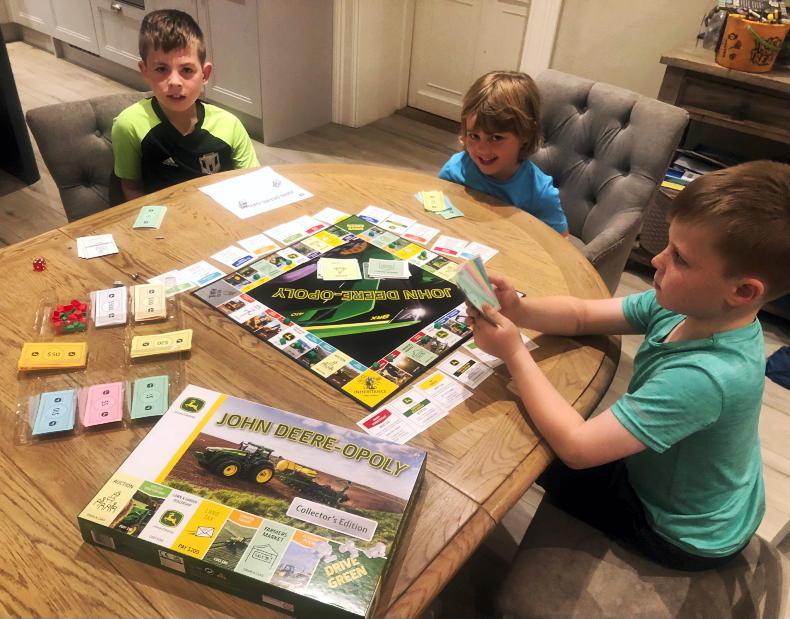 Gerard playing JOHN DEERE-OPOLY with his brothers Daniel and James.
