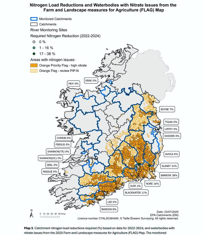 A 7% fall in nitrogen load is required in the Bandon catchment, while a drop of 8% is needed in the Boyne.