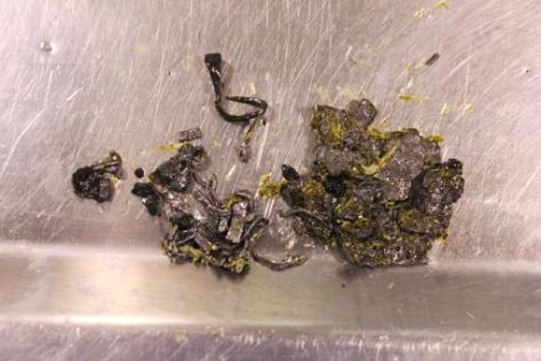 Fragments of a battery found in the stomach of an animal that died from lead poisoning. / Department of Agriculture