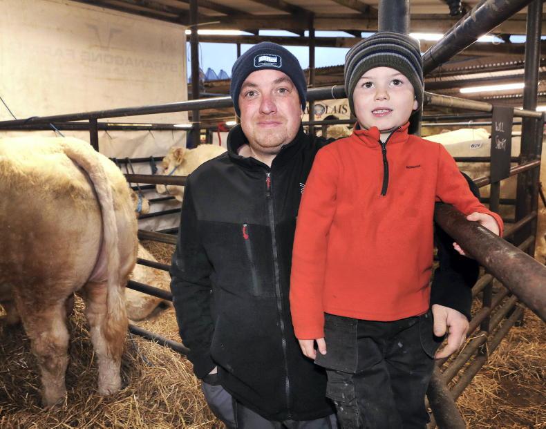 Jonathan Adams and son Alfie from Bellaghy, Co Derry, at the Charolais Club's Elite Autumn Export Show and Sale in Swatragh Livestock Market, Co Derry. \ Peter Houston