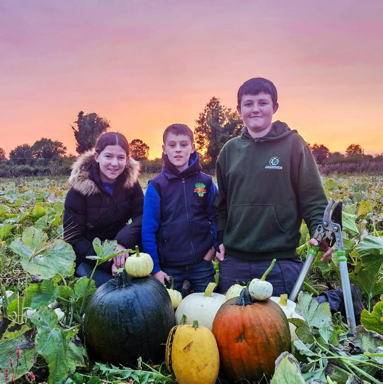 Eimear, Sean and Conor Guy snipping pumpkins on their farm in Co Meath. \ Barbara Guá