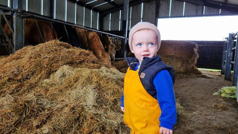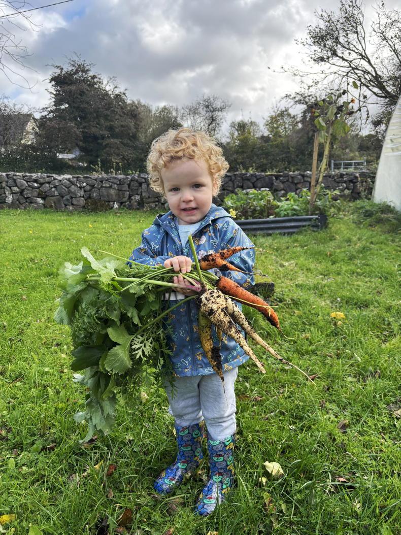 Two-year-old Matthew Foley collects fresh carrots and parsnips from the garden in Athenry, Co Galway. \ James Foley