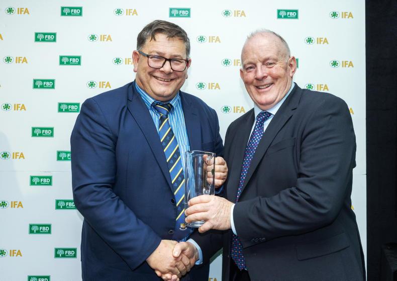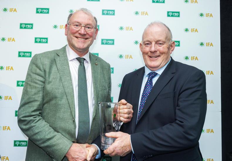 IFA grain chair Kieran McEvoy receiving a presentation from IFA president Francie Gorman at the 71st AGM in the Irish Farm Centre.