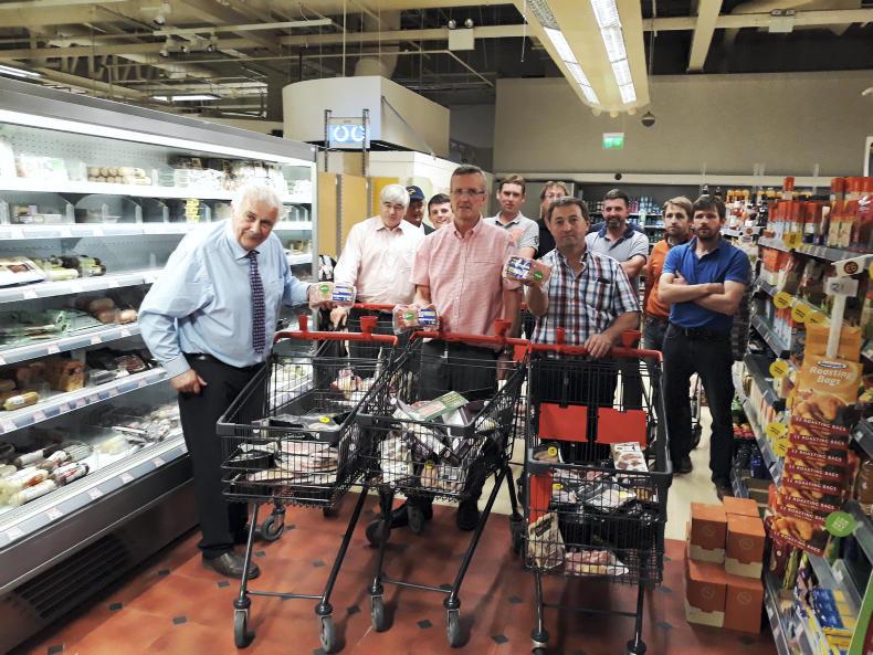 Up to 20 pig farmers loaded up shopping trolleys with imported pork to highlight the proliferation of foreign produce in Irish supermarkets, as growing feed bills and imported pork place increasing pressure on their own product.