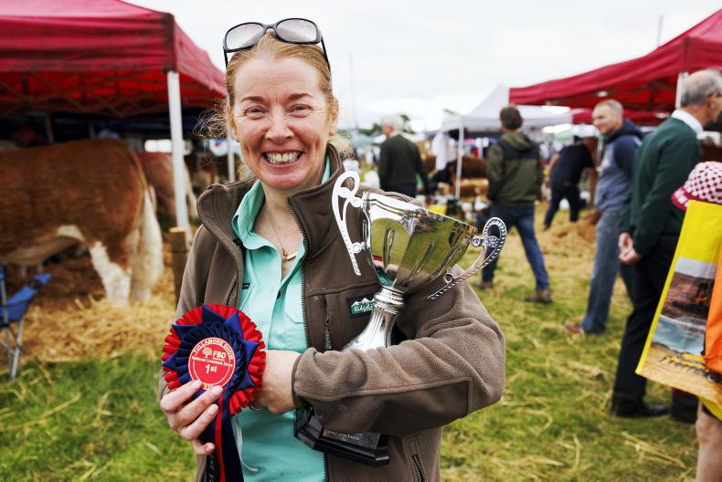 Antoinette Larkin, Loughrea, Co Galway minding the trophy for her daughter Tess after she won the Senior Young Handler title at Tullamore show. \ Donal O'Leary