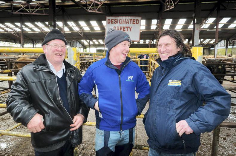 Enjoying a joke at the special heifer sale in Elphin Mart were, from left: Michael Raftery from Ballintubber, Co Roscommon, David Gibbons from Strokestown, Co Roscommon, and Kevin McCloskey from Enfield, Co Meath. Picture: Gerry Faughnan