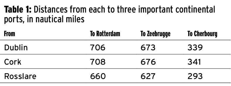 Unfortunately, the geography is not what you might think it is. Intuitively, Cork and Rosslare feel like they must be a lot closer to the continent than Dublin, but they are not. Table 1 below shows the distances from each to three important continental ports, in nautical miles.