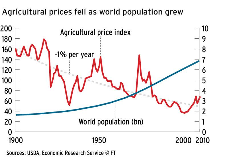 The chart graphs the growth in population against the prices farmers receive for a basket of the main farm-produced commodities.