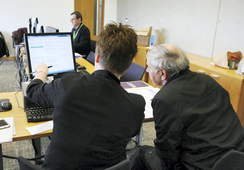 Department of Agriculture staff member Claire Bryan assists farmer Columba Conlon at the Drumshanbo BPS online clinic in Co Leitrim last month. \ Brian Farrell