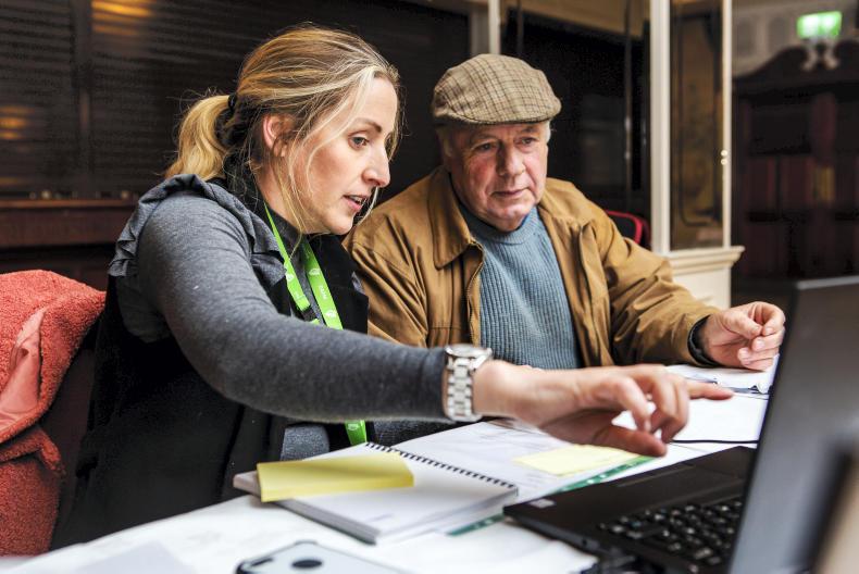 Mary Moore from the Department of Agricuture's Direct Payments Unit assists Tom Lee from Ballymahon in Co Longford at the BPS Clinic in the Longford Arms Hotel. \ Philip Doyle.