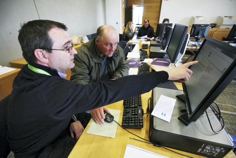 Brian Alcock of the Department of Agriculture assists farmer Gerry Murray at a BPS application clinic in Drumshanbo, Co Leitrim. \ Brian Farrell