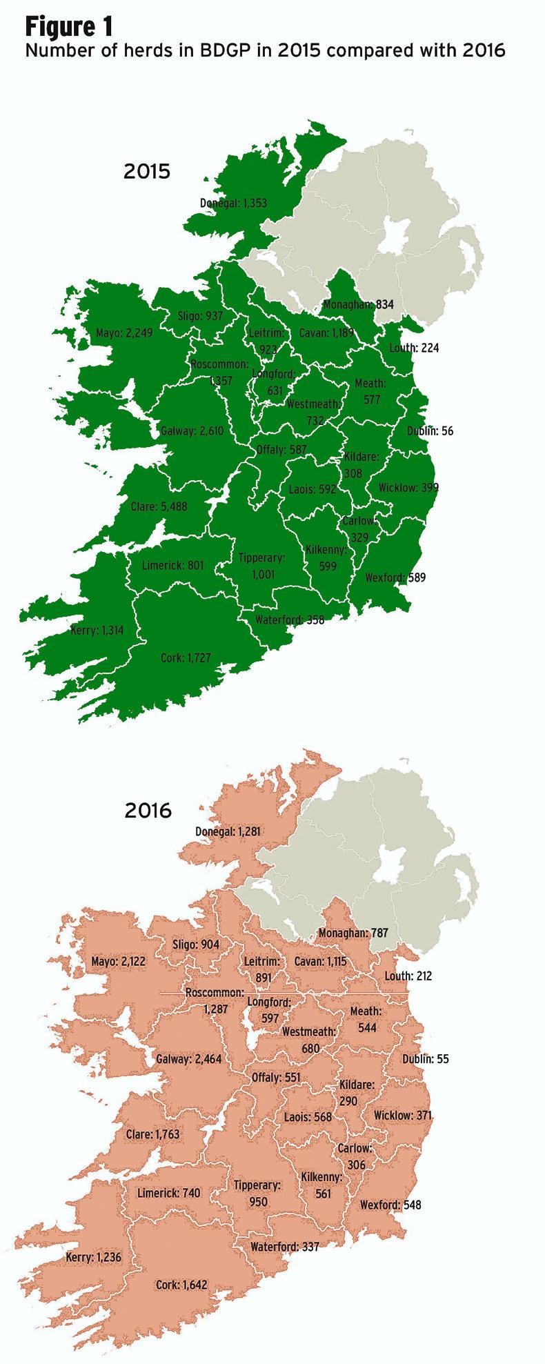 There was a nationwide fall of 1,303 herds or 5.4% successfully claiming BDGP money in 2016 compared with 2015. This led to a €1.6m reduction in the total amount of payments to farmers under scheme last year, or 3.7%.