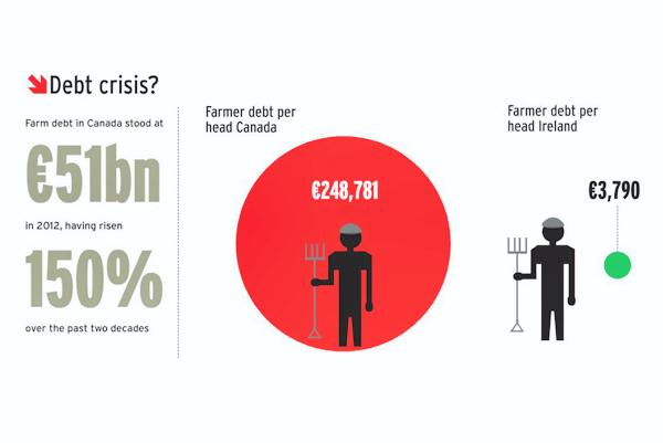 Canadian farm debt levels have risen 150% in the past two decades and figures from Statistics Canada (equivalent of the CSO) show another record debt level in 2012 of more than $70bn (€51bn). According to the Central Bank of Ireland, farm debt in Ireland for last year was €530m.