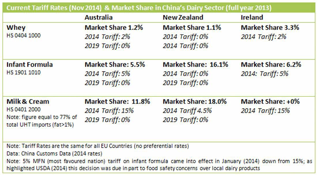 According to Bord Bia's Alan O'Brien, who has analysed the implications of the agreement on global beef and dairy, the agreement will have a positive outcome for the country's dairy sector, which has been maginalised as a major exporter due to a decrease in its overall dairy production. Australia's competitive position in the Chinese dairy market will improve, especially with regard to New Zealand. Tariffs on Australian dairy products are expected to be brought in line with New Zealand and all phased out by 2019. This deal will also impact Europe’s competitive position across key commodities, including infant formula, according to O'Brien.