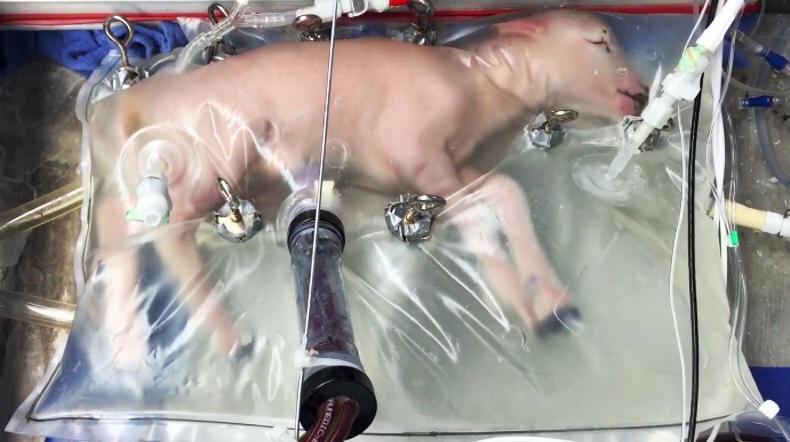 Their hearts pump blood through their umbilical cord into a gas exchange machine outside the bag and electronic monitors measure vital signs, blood flow and other crucial functions.