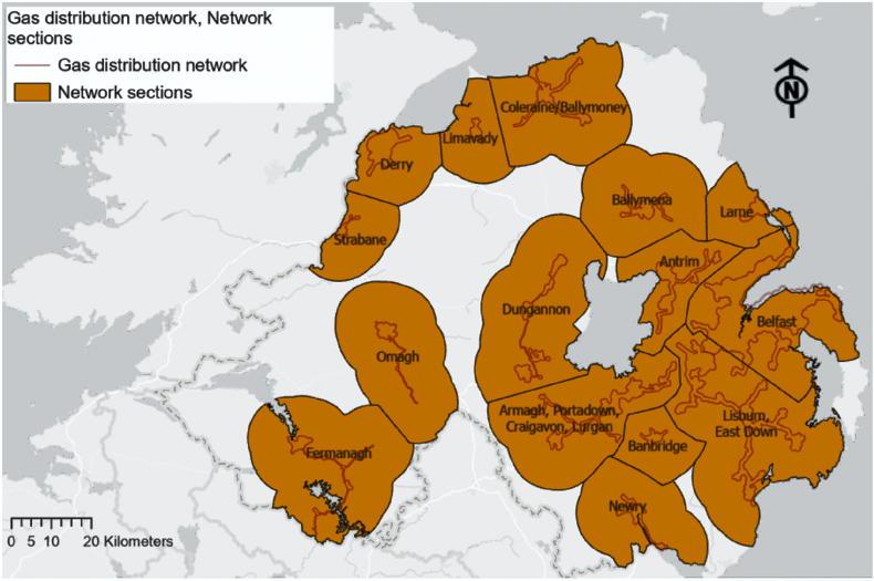 Figure 1. Zones around NI gas grid which would see 70 new AD plants develop