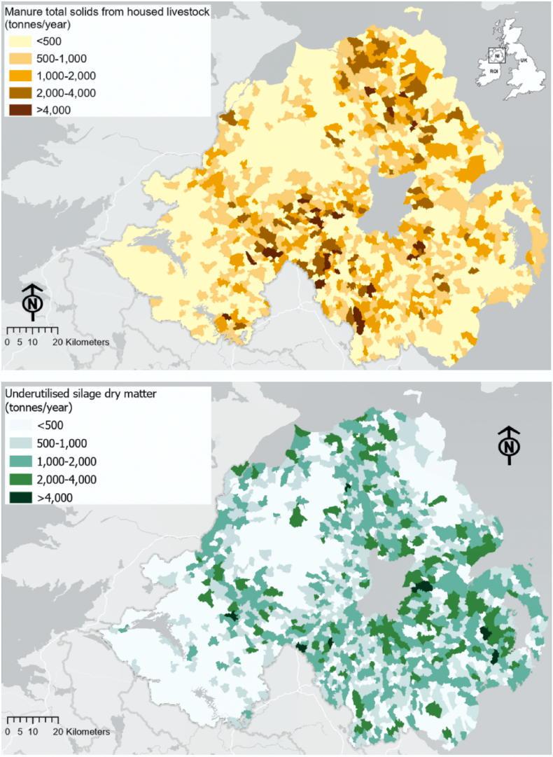 Using geospatial analysis, he looked at the volume of slurries and underutilised grass silage which are available across NI to produce biomethane. Underutilised grass silage is defined as the difference between a farm’s silage (DM) requirement and an average dry matter target of 10t DM/ha. Farms producing over 10t DM/ha were excluded.