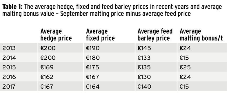 This shows the average value of all the hedge prices for each year, the average fixed price value each year (individual prices where growers did business could have been higher or lower), the average feed barley price (excluding co-op loyalty or bonus payments) and the average malting bonus paid by the harvest-only price relative to the feed barley prices.