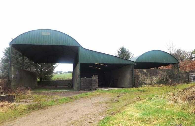 Buildings include a three-bay covered silage pit with lean-to, a three-bay loose-bedded shed, an enclosed concrete yard with a cattle-crush, an old cow barn and an old derelict dwelling.