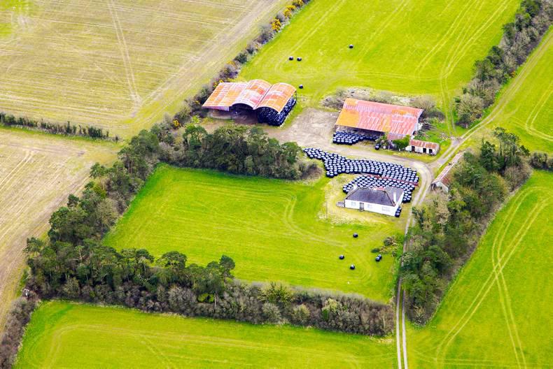 Behind the house are a number of four and five-bay round roof sheds with lean-tos that are currently being used to store baled silage.