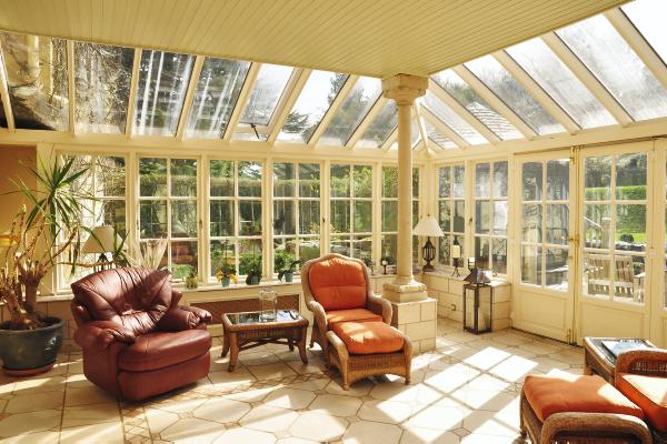 The next room over is a comfortable library room which expands out through double doors to a spacious sun room that looks onto the gardens.
