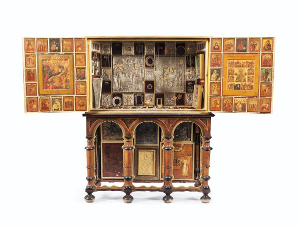 Among the furniture in the sale is a Russian household shrine which contains 15th and 16th century icons and an impressive pair of William Kent-style console tables.