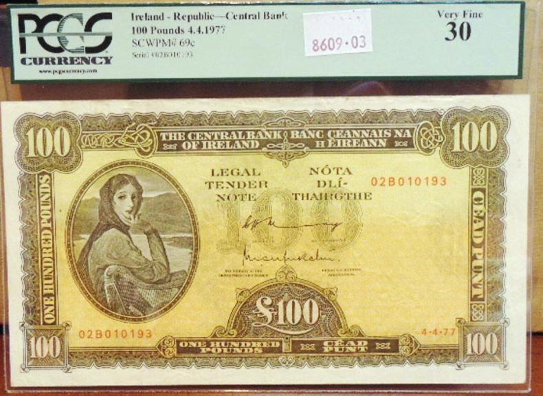 6. Old Irish bank notes are making good money. Lot 105 is a scarce Lady Lavery £100 note dating from 1977 and it sold for €520. Ploughman’s notes from the 1930s are making up to €600 for a £1 note, and up to several thousand euro for a £10 note. Condition and the bank that issued it adds to the value.