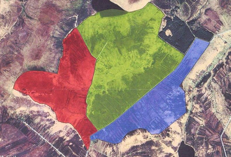 Lot 1 contains 79.7ac (coloured blue on the map) and the largest portion, 178.6ac (coloured green on the map) is offered in Lot 2. The balance of the land is in Lot 3 which consists of 90ac (coloured red on the map).