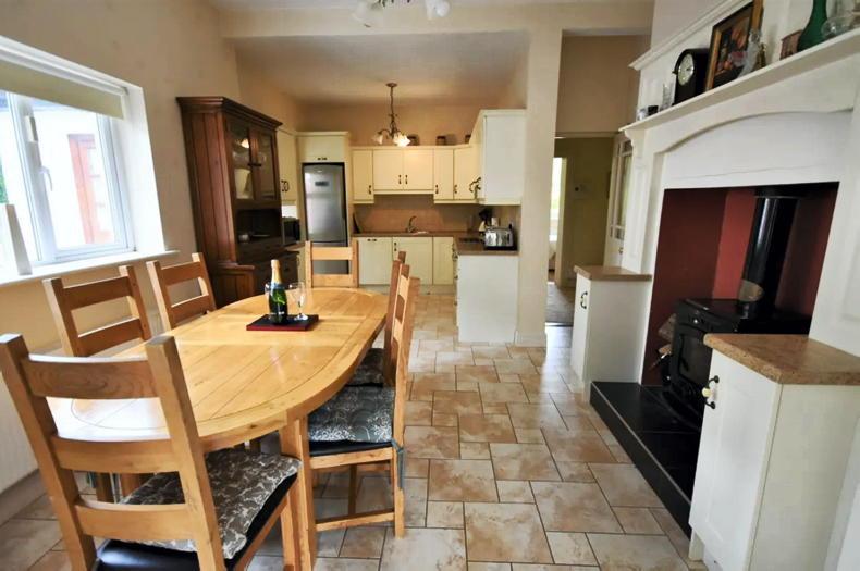 Downstairs there is a sitting room with open fire and a dining room. The open plan kitchen is centred around a Stanley insert stove and is located toward the rear of the house. Just off the kitchen is a sunroom with large glass windows. There is also a utility room, storage room, bathroom and one en-suite bedroom downstairs.