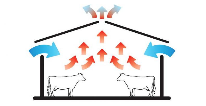 The fact that animals produce heat works to our advantage when trying to properly ventilate sheds. Heat rises and so the heat that our cattle produce in the shed pushes air upwards, towards the roof. This is where our air outlet comes into play – air should have a route to escape from the shed (outlet) at its highest point.