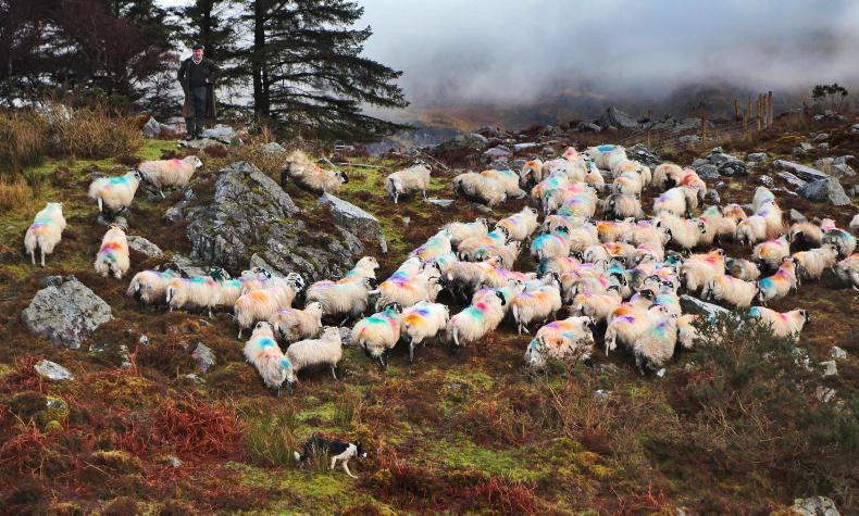 Donal Foley's colourful ewes on his sheep farm, Cuas, MacGillycuddy's Reeks, Co Kerry. The colours are carefully coded by Donal during breeding. \ Valerie O'Sullivan