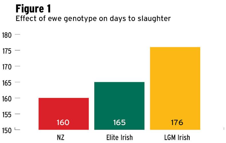 This trend was also evident in lamb performance, as can be seen in Table 2. As expected, this influenced the days to slaughter figure and drafting rate for lambs. This is detailed in Figure 1 and Figure 2, with 96% of the New Zealand born lambs drafted off grass alone, 82% of the elite Irish progeny and 69% of the LGM Irish group.