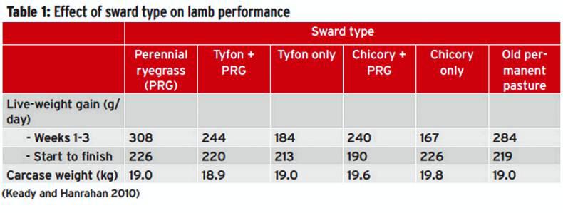 There has been interest in the inclusion of alternative forages in grass seed mixtures sown in late May for grazing by lambs post-weaning. Results from a study at Athenry showed that neither tyfon nor chicory, offered as the sole forage or in combination with perennial ryegrass, had beneficial effects on lamb performance relative to a new perennial ryegrass reseed or to well-managed old permanent pasture.