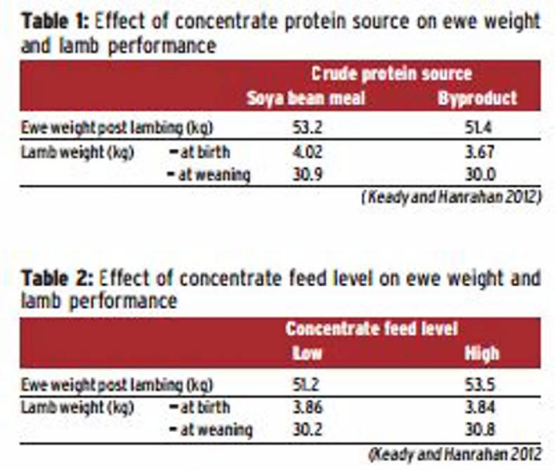 The soya bean meal-based concentrate cost €20/t more than the by-product-based concentrate. Therefore, for twin-bearing ewes which were offered 16kg concentrates in late pregnancy, offering the soya bean meal based concentrate increased concentrate cost by only €0.32/ewe, while increasing individual lamb weaning weight by 0.9kg.