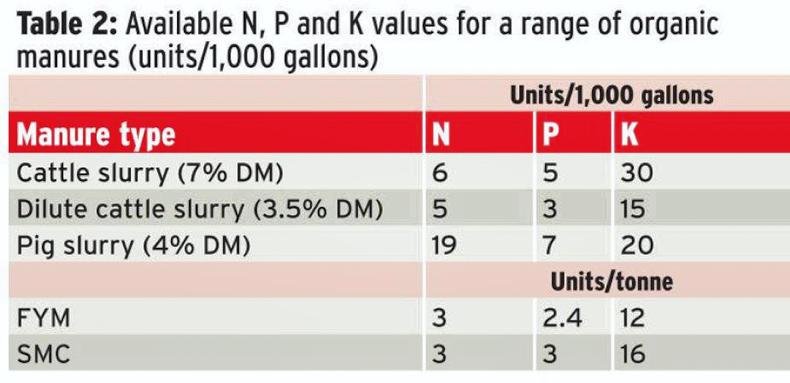 He says that for him the most suitable fertilizer for sheep farms that are not cutting excessive silage/hay crops is something like two bags of 18-6-12 or a bag and a half of 10-10-20, followed by 24s, 27s or straight nitrogen fertilizers. These rates can be reduced if soils are also receiving organic manures (values shown in Table 2).
